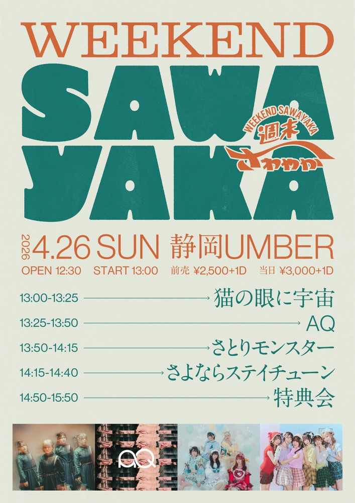 WEEKEND SAWAYAKA SCHEDULE 2026/04/26(日) 静岡UMBER 地図を表示 OPEN 12:30 / START 13:00 さよならステイチューン / AQ / 猫の眼に宇宙 / さとりモンスター ◾️チケット情報◾️ 前売 ¥2,500 / 当日券 ¥3,000 (各+1D) 受付期間:2026年4月10日(金)18:30~2026年4月26日(日)13:00 ご予約は こちらから TICKET URLをコピーする 報告する