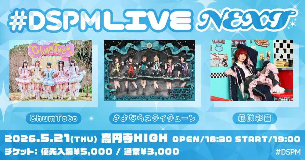 #DSPMLIVE NEXT SCHEDULE 2026/05/21(木) 19:00 - 高円寺HIGH 地図を表示 OPEN 18:30 / START 19:00 ChumToto / さよならステイチューン / 藤咲彩音 ◾️チケット情報◾️優先入場 ¥5,000通常 ¥3,000 4/25 18:00から先着販売開始 チケットページ URLをコピーする 報告する