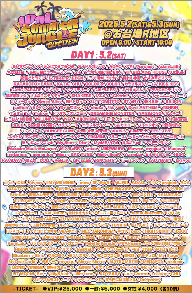 IDOL SUMMER JUNGLE GOLDEN SCHEDULE 2026/05/02(土) お台場R地区 OPEN 9:00 / START 10:00 ◾️チケット情報◾️・VIPチケット:¥25,000・一般チケット:¥5,000・女性チケット:¥4,000※2日通し券なし/各税込/1D代別途 チケットページ(両日程/全券種共通) URLをコピーする 報告する