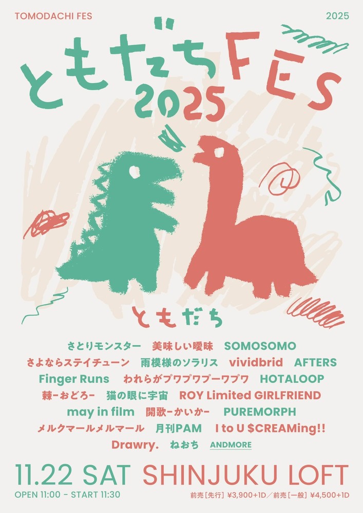 ともだちFES 2025 SCHEDULE 2025/11/22(土) 『ともだちFES 2025』 日程:2025年11月22日(土) 会場:新宿LOFT 時間:OPEN 11:00 / START 11:30 ◾️チケット情報◾️ 先行ともだち割3,900円+1D (2025/10/11 18:00〜 10/19 23:59) 一般4,500円+1D (2025/10/24 18:00〜 11/22 11:30) https://t-dv.com/tomodachifes2025 URLをコピーする 報告する
