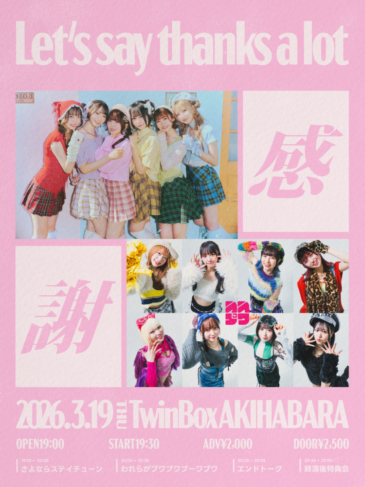 Let's say thanks a lot SCHEDULE 2026/03/19(木) 19:30 - 秋葉原 TwinBoxAKIHABARA 地図を表示 OPEN 19:00 / START 19:30 われらがプワプワプーワプワ/ さよならステイチューン ◾️チケット情報◾️ 前売 ¥2000 / 当日 ¥2500 +1ドリンク 2/19(木) 22:30 販売開始 チケットページ URLをコピーする 報告する